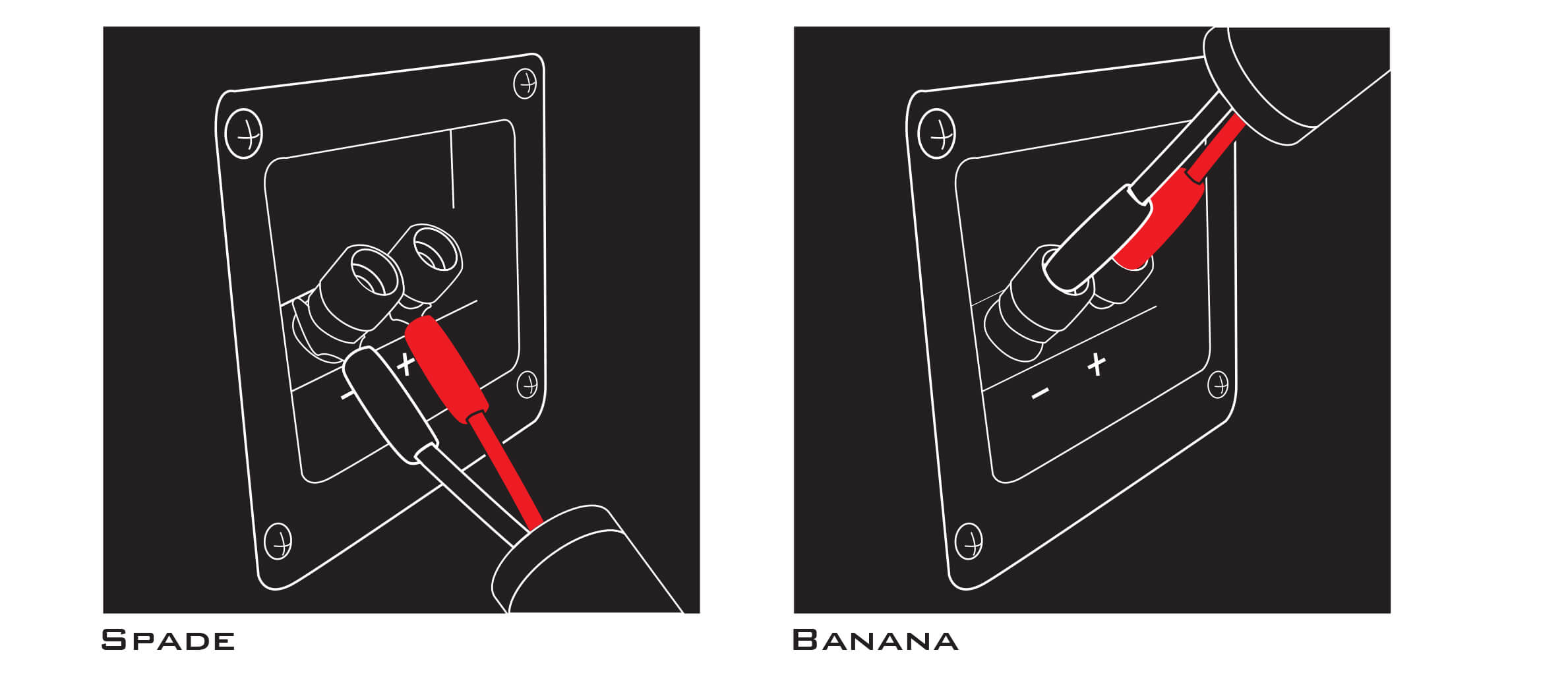 If your speaker cables teminate in banana, insert your XOT Carbon spades into the lossened binding post directly underneath your speaker cables, making sure that red goes to red and black goes to black. Tighten binding post.