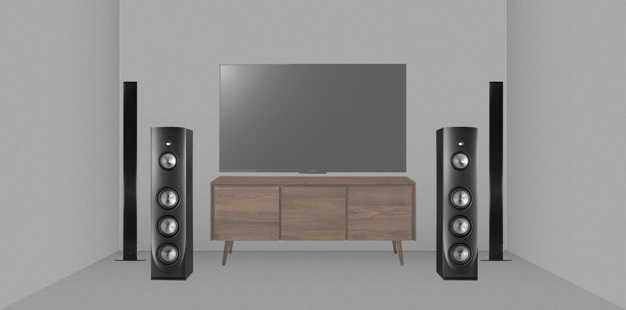 2nd Atmosphere Satellite - With the Atmosphere Infinity or Atmosphere Mini X4 and 1st Atmosphere Satellite in the corners behind the speakers, place the 2nd Atmosphere Satellite centered, behind the listening position