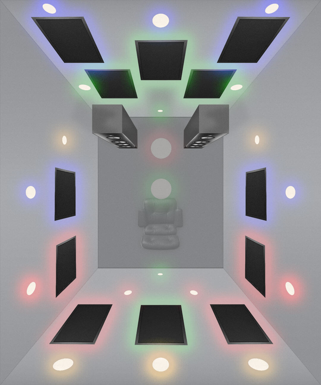 One panel is to be placed centered on the front wall approximately 4-5 feet from the floor and One panel centered on the back wall approximately 5-6 feet from the floor. Two panels placed on either side of the front panel, 3.5-4.5 feet from the floor and 1 foot from the wall. Two additional panels are added above the right and left front wall panels, replacing the existing dots. Another two panels are added to the right and left walls, replacing the existing dots. Two new panels are placed on both sides of the back panel, a foot from the wall. Then two more panels are placed on the right and left side between the back wall and the center panels.
