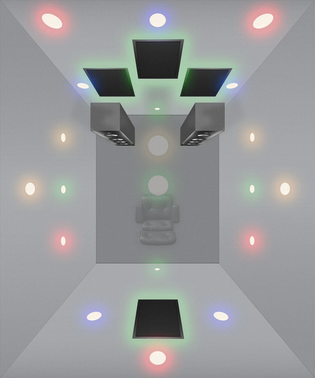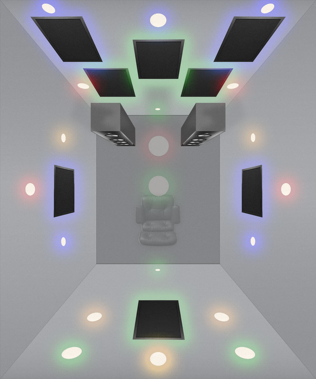 Dots are placed above both of the front panels, 1.5 feet from the wall. One dot is placed above the top front panel between it and the ceiling and two more dots on the right and left walls between the new panels and the back wall.
