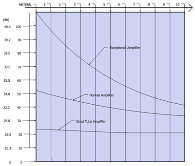 Figure 1: From this graph, you can see the damping factor, and the real damping effect, that are the result of different cable lengths and different cables, as well as different amplifiers. With a good transistor amp, the damping will be decreased about 4 dB with a 5-meter cable. With a good tube amp, the damping will lose about 2 dB (the original damping with the tube amp was about 14 dB less, however).