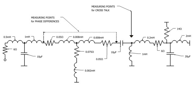 Figure 3: This is a simulation diagram. The two components at the far left simulate the woofer resistance and inductance. The next two components are the low pass filter for the woofer. Of the next six components, the horizontal graphic represents two cables, and the vertical graphic represents the output impedance of the amplifier. The broken line converts from bi-wire to single wire. After the conversion, the first two components represent the high pass filter to the tweeter, and the five remaining components represent the tweeter.