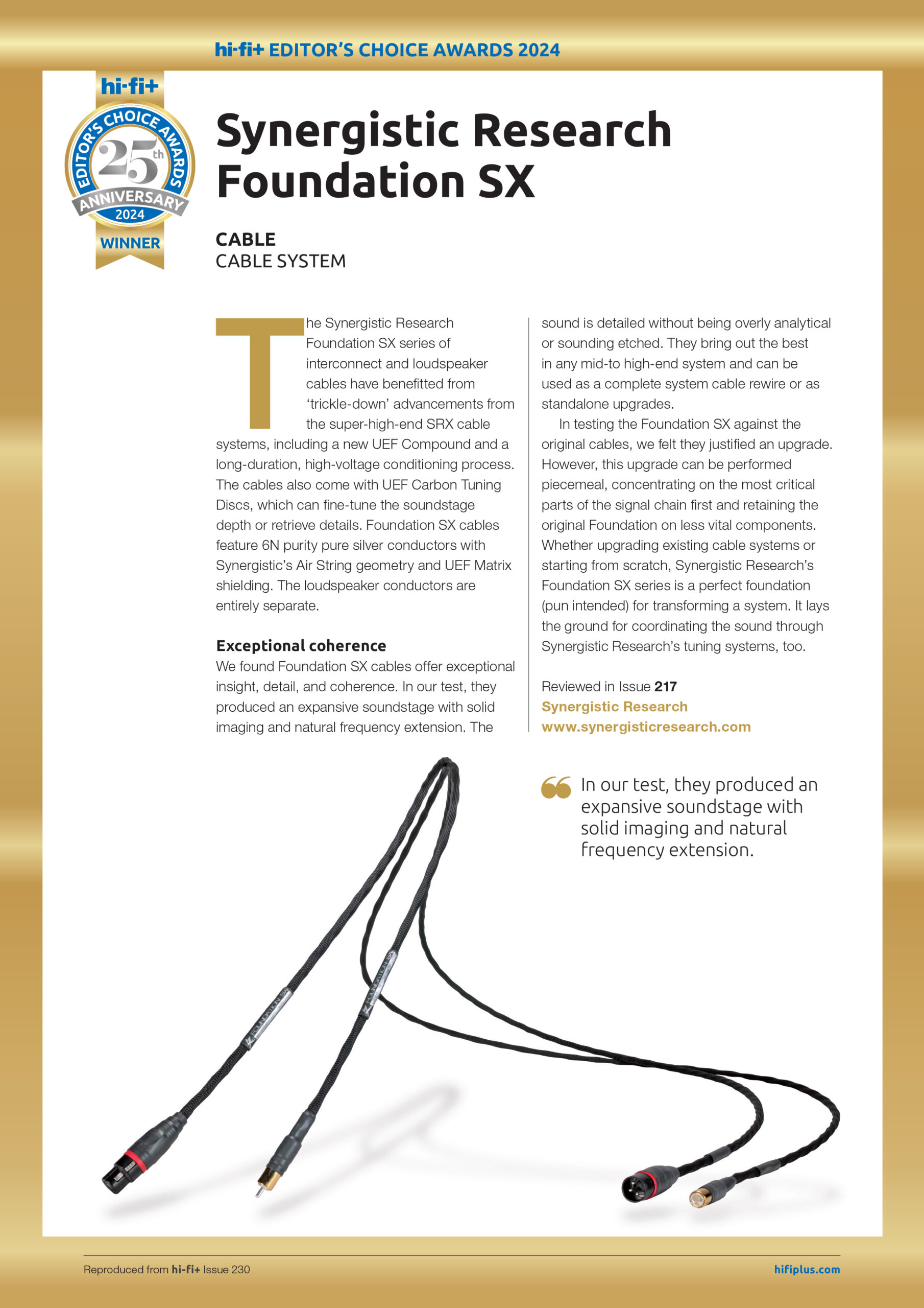the ultimate question is whether the Synergistic Foundation SX cables contribute enough to the musical experience and bring the listener closer to the musical event. I have found them to be so musical that I will be asking Synergistic Research for an extended evaluation so a few friends of mine can see how they compare with their costly cables and use them in future reviews. They are very good musical components and deserve an audition.”
